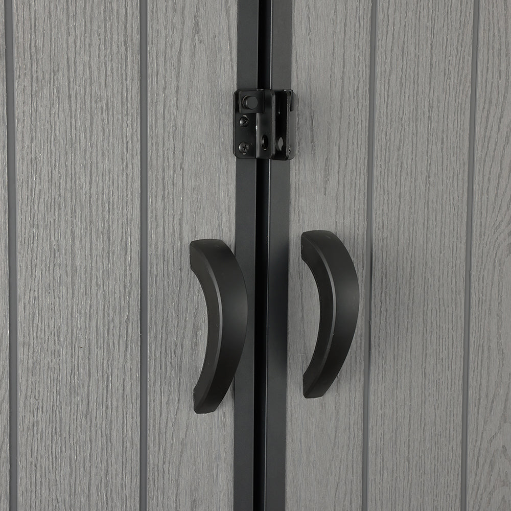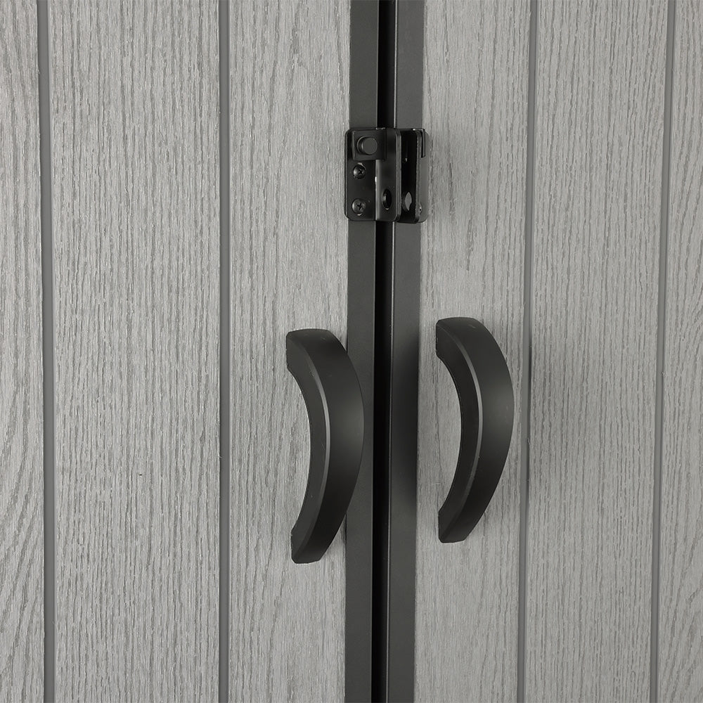 Upgrade your garden with this premium grey wood-grain garden tool shed, combining style, durability, and practicality. Its apex roof efficiently drains rainwater, protecting your belongings and extending the shed’s lifespan. A sturdy floor ensures stability on varied surfaces, while wide double doors with handles provide easy access for large tools and equipment. The side window brightens the interior, and two built-in vents improve air circulation to prevent dampness. This sleek, space-efficient storage solution keeps your garden organised, secure, and visually appealing — perfect for any modern British backyard.