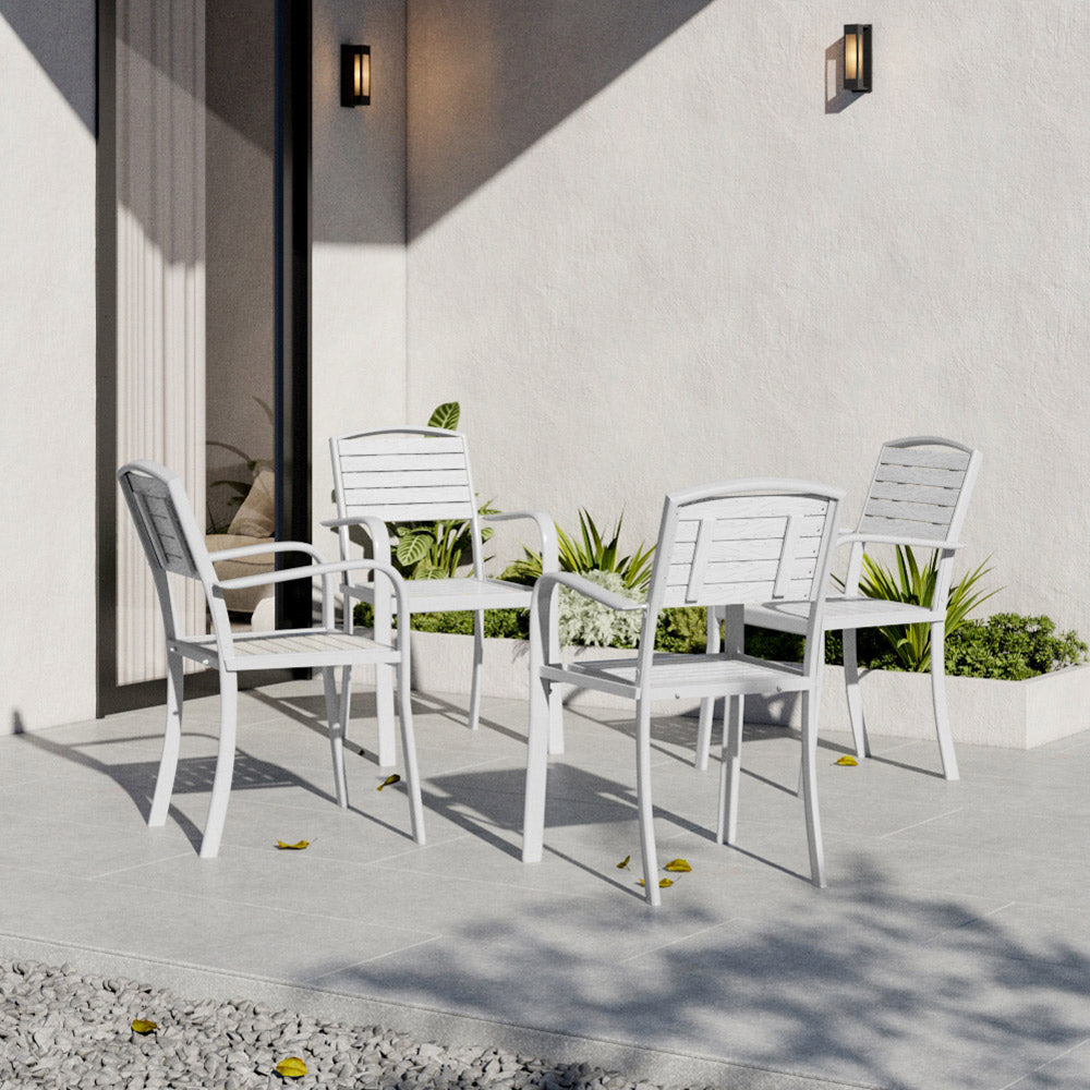 This robust set of garden dining armchairs is constructed from weather-resistant materials for long-term durability. The chairs feature an ergonomic design with supportive backs for optimum comfort. The classic white/grey/brown hue and contemporary style make them a perfect addition to any modern environment.
